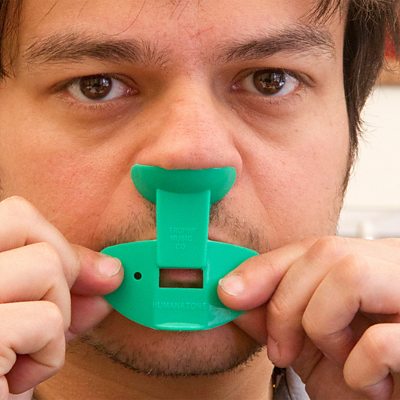 Jamie Cullum plays the noseflute backstage at the 2014 Cheltenham Jazz Festival