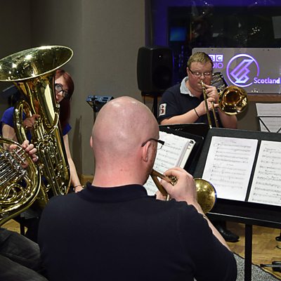 Brass quintet, Pure Brass, play three pieces, live in the studio. Session tracks: Paul Dukas - Fanfare from La Peri Giles Farnaby - Fancies Toyes and Dreames Dougie MacLean - Caledonia