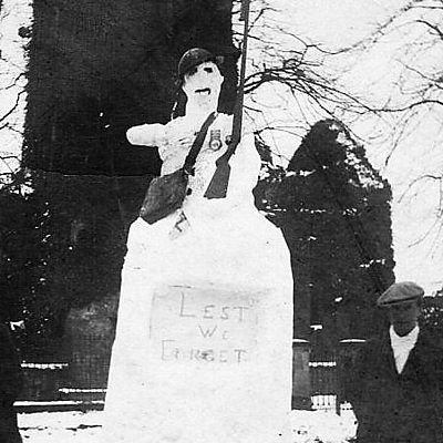 Newtownards in County Down is a busy market town, thronged with cars and shoppers. After the war, it saw the creation of an extraordinary memorial. When the fighting ended in 1918 the country was in mourning. Memorials were erected in many towns and villages. They were a focus for people to gather and to grieve for those who never returned home. But in Newtownards, where unemployment was high, the challenge of raising money to fund a memorial proved difficult. Professor Fran Brearton, of Queen's University Belfast and the Arts and Humanities Research Council, has studied the story. Professor Brearton describes how, in 1924, frustrated ex-servicemen took matters into their own hands at the town's Bowling Green. Location: Newtownards, County Down, BT23 7PA Image of former soldiers at the snow memorial, March 1924