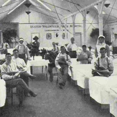 Queen's University is in the leafy heart of south Belfast. During the war an avenue of wooden hospital huts was erected in the grounds between the university and Botanic Gardens. This was one of many hospitals quickly established to deal with mounting casualties from the front. Most famously James Craig, the future Prime Minister of Northern Ireland, gave over his home - Craigavon House in east Belfast - to help those who suffered shell shock. Dr Tim Bowman (of the University of Kent and the Arts and Humanities Research Council) explains how the local community rallied together in a time of need. Location: Queen's University Belfast, BT7 1NN Image of the Londonderry Wing of the UVF Hospital complex at QUB Image courtesy of the Public Records Office of Northern Ireland (ref D2585/20/18)
