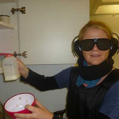 Rebecca Kesby gets a frightening glimpse into our physical futures. (Photo: Rebecca Kesby in simulation suit Credit: Jerry Sullivan)