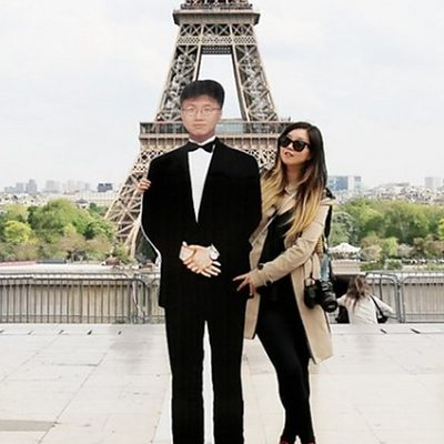 When New Yorker Jinna Yang lost her father, Jay Kwon Yang, to stomach cancer in 2012, she decided to take the trip of a lifetime that he'd always planned for himself. To honour him, she decided to take a life-size cardboard cut-out of him with her. (Photo: Jinna and the cut-out of her father in Paris. Credit: Jinna Yang)
