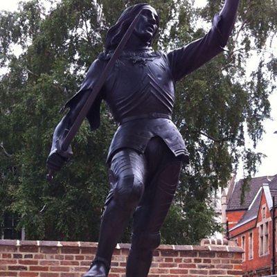 The statue of Richard III is placed in to its new home outside Leicester Cathedral.