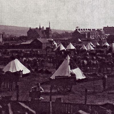 In August 1914, fields around the small village of Edgworth near Bolton were turned into a full blown army camp. More than 5,000 soldiers from the Lancashire Fusiliers camped with their support units between Edgworth and Turton Station. The men from Bury, Rochdale and Salford were Territorials- soldiers who had joined up before the war as part-timers. The local press described how on Sundays families from the three towns came to Edgworth to visit their loved ones. One newspaper commented how ''there was a carnival atmosphere.'' The troops finally left after a month before being sent to guard the Suez Canal and ultimately the landing at Gallipoli in Turkey in 1915. Many men failed to return. Location: Sharples Meadow, Edgworth, Lancashire BL7 0PE Image: View of the camp at Sharples Meadow in Edgworth, courtesy of the Fusiliers Museum. Bury