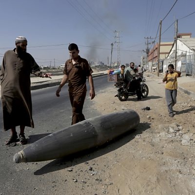 Not all missiles fired in conflicts explode where they land, so bomb disposal units have the task to make them safe. It is a dangerous job - on Wednesday five people were killed in an explosion in Gaza. Members of a bomb disposal team and two journalists died as efforts were being made to try to dismantle an Israeli missile. Times of London reporter, Bel Trew met with one the bomb disposal team and gave her reaction to learning of the deaths. (Photo: Palestinian onlookers and motorists pause to inspect a bomb from the Israeli military lying unexploded in the Gaza Strip. Credit: AP Photo/Adel Hana)