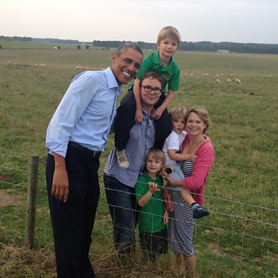 US President Barack Obama paid a visit to Stonehenge on his return home from the NATO summit in Newport. The White House said that the presidential helicopter Marine One made an unannounced stop at Boscombe Down Airbase, Wiltshire before his motorcade drove to the ancient monument. The president was then given a guided tour by curator Heather Sebire. English Heritage, which manages the site, said it was 'an honour' to host the president. Janice Raffle and her family met Barack Obama at Stonehenge and said the US President tried to high-five them and 'photobombed' them.