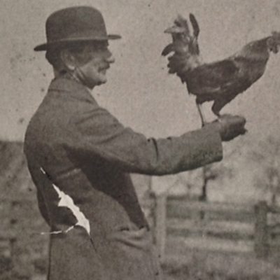 A feathered fundraiser raised £14,570 for the war effort after being bought at a Red Cross sale by Frank Fyson. Frank was too old for service and had no sons to send to war so he travelled the country auctioning a Bantam cockerel. The honour of ownership of the bird just for a few minutes became legendary with the bantam cock earning the name ‘the VC cockerel’. The money raised was distributed by the Red Cross and the cockerel’s owner, Frank, was awarded a silver cup for his efforts. Location: Warboys, Huntingdon, Cambridgeshire PE28 5TA Image: The VC cockerel with Frank Fyson, courtesy of Joan Cole