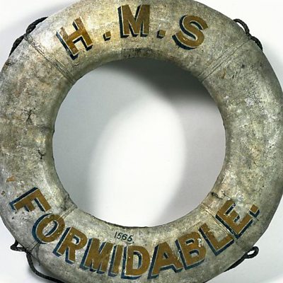 On New Year’s Day, 1915, the British Navy lost its first battleship in a submarine attack. HMS Formidable was sunk in Start Bay, 23 miles east of Start Point. Altogether 547 men and the captain’s dog Bruce, were lost. Survivors reported seeing the second in command, the ship’s chaplain and Captain Arthur Loxley smoking pipes as their ship went down. However, 199 men survived. Some were picked up by the naval vessels Topaze and Diamond, others by the Brixham trawler Provident, and 51 rowed in raging seas to Lyme Regis. The Provident, owned and captained by William Pillar, was part of a dramatic rescue of 71 sailors, who were landed at Brixham and are remembered in the town’s museum. Of the 51 who arrived at Lyme Regis, 48 survived. They had rowed 41 miles and for 22 hours. The men were cared for in the Pilot Boat Hotel. The landlady’s dog, a rough-haired collie called Lassie, licked one seaman back to life. Lyme Regis buried six men of the Formidable and the ship’s memorial is in the town’s cemetery. The body of the captain’s dog (an Airedale terrier) was washed up near Abbotsbury. Bruce is buried there. Location: Start Bay, Kingsbridge, Devon TQ7 2ET Image: A life belt from HMS Formidable