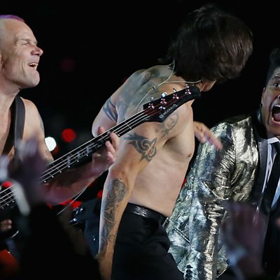 A chilly February in New York - where Sportshour headed to see the unique collision of sport and showbiz. The city was hosting the Superbowl for the very first time. It is the world's most watched annual sporting event, not least because of the music concert known as the half time show. Hear from the director of that show, Hamish Hamilton about the nervous wait before his moment in the spotlight. Photo: Bruno Mars performs with Anthony Kiedis and Flea of the Red Hot Chili Peppers during the Super Bowl XLVIII Halftime Show at MetLife Stadium, February 2014 (Credit: Rob Carr/Getty Images)