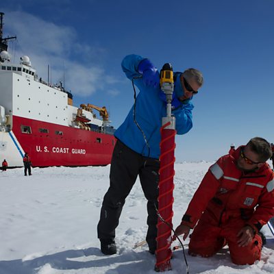 On a recent research voyage through the Arctic ice cap, a scientist made a simple, yet significant discovery that solves one of the great mysteries about Arctic ice melt. Photo: Ice scientists Ken Golden and Chris Polashenski drill a plastic tube into the Arctic ice cap as part of their research into melt ponds that form on the ice every spring. Credit: Amanda Kowalski/Woods Hole Oceanographic Institution