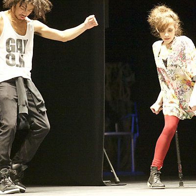Austrian Tanja Erhart had her left leg amputated aged six. But despite that she's become a successful professional dancer. For Outlook Hilary Dunn met Tanja during rehearsals for 'The Show Must Go On' with mixed ability dance company, Candoco Picture: Tanja Erhart (Right) seen performing using crutches with a Candoco colleague