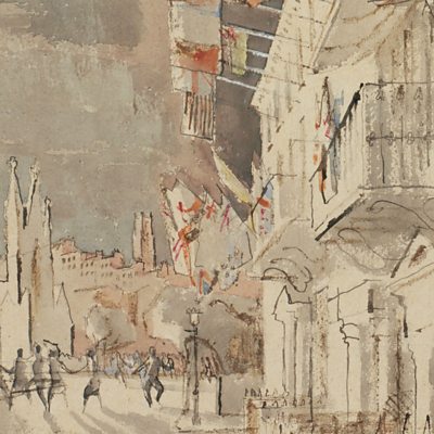 Painter and teacher Clifford Ellis was a shy and quiet character, so it is no surprise that his painting of people celebrating in Bath on VE Day is discreet and understated. Clifford was a graphic artist and illustrator, working mainly with his wife, Rosemary. In collaboration they designed pieces for Shell, The General Post Office and London Transport. As well as this he was also the Principal of Corsham Court at the Bath Academy of Art. Two artists who worked under Clifford and knew him well, are John Eaves and Michael Pennie. They describe Clifford’s VE Day scene and the personality behind the painting. Interview with John Eaves and Michael Pennie Image: VE Day in Bath, courtesy of the Imperial War Museums