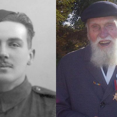 George Evans was in the army in 1945. He was in the 1st Seventh Battalion of the Royal Warwickshire Regiment. He was in the infantry – a private soldier. He says it was the worst time in the world… In 1944, George was travelling with his company when he came across a pile of bodies from the Hitler Jugend Division. They buried them – but it changed George’s attitude to fighting and he decided for the rest of the campaign he would fire over the heads of the opposing side…he became a pacifist. As they travelled through Europe, liberating the towns they came through it became more and more apparent the war was drawing to a close. George was making his way through northern Europe – as he puts it – digging holes. He says a slip trench was a soldier’s friend. On the day before VE Day, he had dug his trench, gathered his blankets and settled for the night. In the morning he was met with the news the Germans had surrendered and the war was over. He made for a farmhouse a couple of fields away. He went in, shouted, but there was no answer. On the sideboard was a bottle of Schnapps. He swapped it for a packet of cigarettes he was carrying and set off back to his trench. One sip was not enough and George felt obliged to finish the bottle. He passed out and slept for the next day and night. When he woke and went off to find his breakfast he was given the news he was on leave but he had missed the transport. He set off to hitch to the coast, finally caught up with the lorry and got back to England. Image: George then, and now