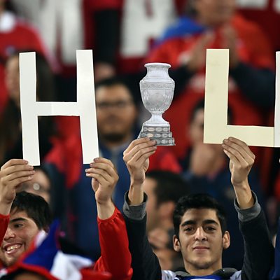 Chile international Mark Gonzalez and Peru's assistant coach Nolberto Solano look ahead to the Copa America final in Santiago, as the hosts Chile prepare to take on Argentina. Also we look at the problem of fan violence in Chilean club football and why does South America not care about the Women's World Cup? (Photo: Chile fans hold card cut-out letters to spell Chile. Credit: Getty Images)