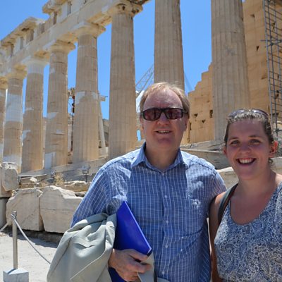 Heini Davies o Fangor sy'n tywys Dewi i ben yr Acropolis a son am apel Gwlad Groeg