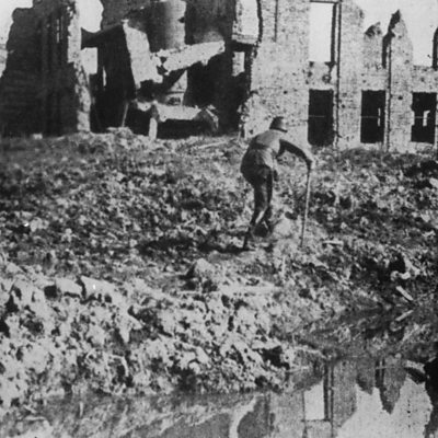 The ÃÛÑ¿´«Ã½'s Paul Winterton was only allowed to enter Stalingrad when the battle was over. His calm delivery barely concealed the horror of what he witnessed. (Photo: 1943. A lone German soldier hobbles round a waterlogged crater in which are reflected the devastated buildings of Stalingrad. (Credit: Keystone/Getty Images)