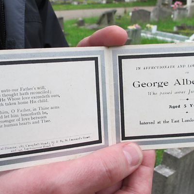 On 13 June 1917, a bomb from a German Gotha aircraft hit the Upper North Street School in Poplar, east London. Eighteen children were killed. The majority of the dead were aged between 4 and 6-years-old. The deaths led to one of the biggest funerals the East End had ever known. Thousands of people lined the streets as the children were taken to their final resting place. Fifteen of the dead were buried together in the East London Cemetery in Plaistow whilst three were interred in private graves. Twenty German bombers were involved in the daylight raid on London on 13 June 1917. The Poplar schoolchildren were not the only victims. More than 150 people were killed in the capital that day. Location: Upper North Street School, Poplar, London E14 Image: Funeral card for George Albert Hyde