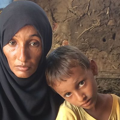 Khadijah and her children were the victims of air strikes in the conflict and have come to the refugee camp in search of safety. (Photo: Khadijah Ahmad, a mother from the Beni Hassan refugee camp in Yemen with one of her four children)