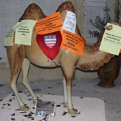 Protestors cover a statue with their messages to Beziers far-right mayor. In the town hall, Robert Menard calls to order a noisy meeting disrupted by demonstrators angered by his attitude to migrants (Photo: Posters are stuck all over a camel by protestors in Beziers’ town hall.)