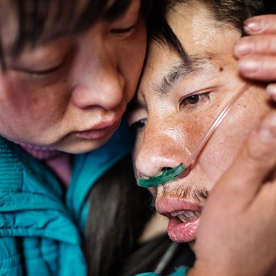 When photojournalist Sim Chi Yin from Singapore began to document the lives of Chinese gold miners, she never expected that she would become closely involved in the life of one man and his family. Former gold miner He Quangui was suffering from silicosis - a lung disease that leaves sufferers desperately struggling to breathe. As Chin Yin got closer to He Quangui and his family, she found herself crossing the line from objective observer, to life saver. Picture: Mi Shixiu (Right) holds her husband He Quangui (Left ) as he struggles to breathe Picture credit: Sim Chi Yin