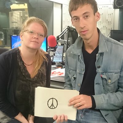 Jean Jullien is the illustrator who drew the widely shared image after the Paris attacks. He says the image isn't political, but merely a mark of solidarity for victims of terror worldwide. (Picture: Jean Jullien joins Rebecca Kesby in the studio)