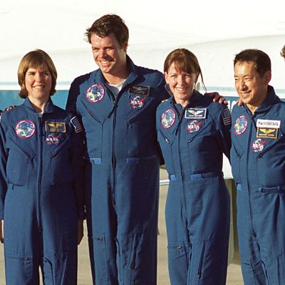 Astronaut, Janice Voss, outlines her feelings about the dangers of spaceflight and why she believers the risks are worthwhile. From Omnibus - Women in Space, broadcast 1 December, 1995 (Photo: Space Shuttle Endeavour's crew (L-R) German Gerhard Thiele, US Janice Voss, US Commander Kevin Kregel, US Janet Kavandi, Japanese Mamoru Mohri and US Pilot Dom Gorie pose for photo 11 January, 2000, upon their arrival at Kennedy Space Center's Shuttle Landing Facility. Credit: BRUCE WEAVER/AFP/Getty Images)