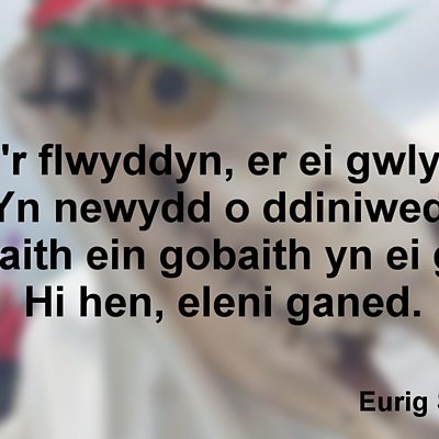 Mae'r flwyddyn wedi'i geni Yn hwyr y nos eleni, A heddiw rhag hangover gwaeth Am lymaid llaeth yn gweiddi. Mae teulu a chyfeillion Yn trydar eu cyfarchion, Yn dod i gwrdd ar ddechrau dydd Ei gilydd yn y galon. Bydd 'leni, taerwn ninnau, Yn ddoethach, er pob amau, Anwylach, callach, gwell ei gwedd Na'r llynedd ar ei gorau. Er gwybod gwell, mae'r ysfa Heddychlon ar ei heitha', A chlo ar iet hen winllan ddu Surfelus y rhyfela. Mae'r flwyddyn, er ei gwlyped, Yn newydd o ddiniwed, Mae iaith ein gobaith yn ei gwên, Hi hen, eleni ganed.