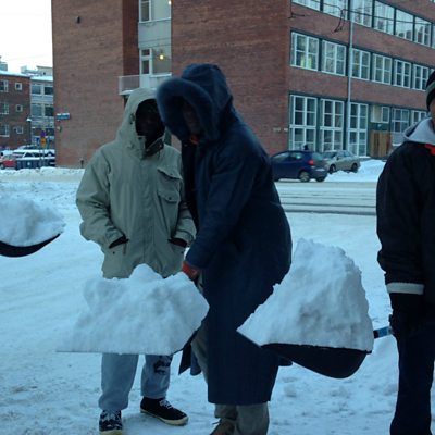 The head of the migration department in the Finnish interior ministry says the government is planning to cut benefits to asylum seekers. (Picture: asylum seekers shovelling snow. Copyright ÃÛÑ¿´«Ã½.)