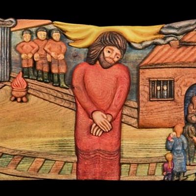Rabbi Roderick Young walks the 'Stations Of The Holocaust' exhibition with Anthony Isaacs