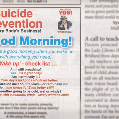 Sheep farmer Tim Barritt, from the Barossa Valley in South Australia, tells Claudia what motivates him to spend his own money writing and placing suicide adverts in his local papers. (Photo: A suicide prevention advert written by Tim Barritt. Credit: Tim Barritt)