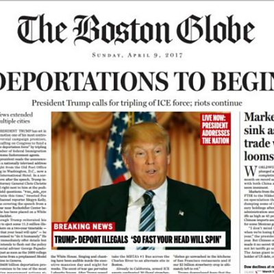 Sunday's Boston Globe had an unusual front page. In what the newspaper describes as a political satire, the mock cover paints a dystopian view of the US with Donald Trump as president. Kathleen Kingsbury, deputy managing editor for editorial at the Boston Globe, explains the idea behind it. (Photo: Screenshot from Sunday's Boston Globe.)