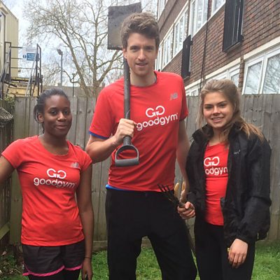 Greg James joins some volunteers from GoodGym who help out in older people's gardens.