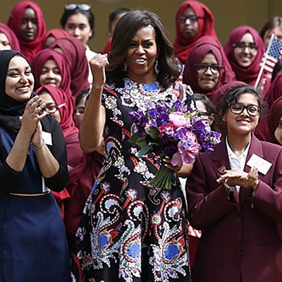 A group of schoolgirls from London got the rare chance to meet America's First Lady, Michelle Obama last year, and she proved a great inspiration to them. All this month, we've been seeking out the world's most inspiring people for our 50th anniversary, where we'll be honouring some of your nominees. We asked Maisha, Elizabeth, Sumaya and Anisa from the Mulberry School for Girls what inspiration means to them - and what their role models have in common. (Picture: Michelle Obama visiting the Mulberry School for Girls in London. Credit: MSFG.)