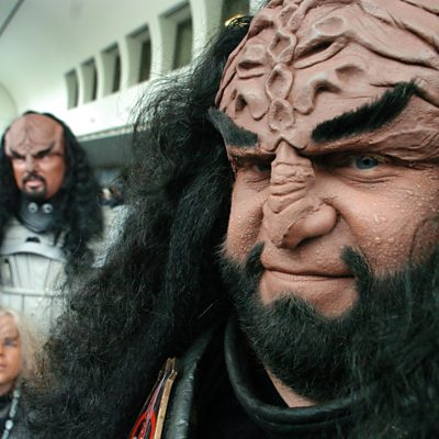 In a ÃÛÑ¿´«Ã½ first, presenter Roger Hearing conducts an interview in Klingon with the language’s inventor, Marc Okrand. Klingon, the language spoken by the fictional Klingons in the Star Trek universe, is at the heart of a copyright case being fought by the studios that own the franchise and the makers of a Star Trek fan movie. Picture: Star Trek fans dressed as Klingons at a Comic-Con Convention in California. Credit: Getty Images