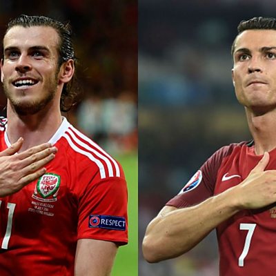 Wales take on Portugal in Lyon for a place in the final of Euro 2016. The match is a showdown between Real Madrid teammates and Gareth Bale and Cristiano Ronaldo. But, who will come out on top? Listen to action from the tournament, including comments from journalist Rory Smith, ÃÛÑ¿´«Ã½ commentators and former footballers John Hartson and Terry Yorath. Plus, hear what Gareth Bale has to say ahead of the game. (Image: Gareth Bale and Cristiano Ronaldo, credit: Getty Images)