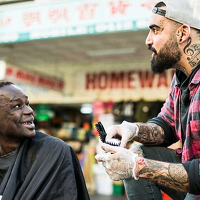 Nasir Sobhani is known in Melbourne as The Streets Barber where he gives free haircuts to the homeless. Nasir overcame a drug problem and told Matthew Bannister about how cutting hair is his new addiction. Image: Nasir Sobhani (r) giving a haircut on the street Credit: Nima Sobhani