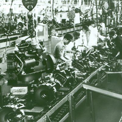Richard Holti from the Open University explains how social conditions in post-war Japan created a recipe for success (Photo: Toyota engine assembly line in 1953. Credit: Toyota Motor Corporation)
