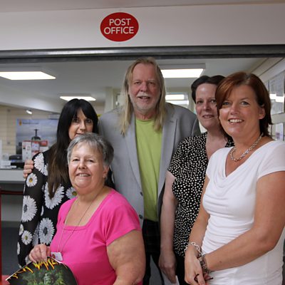 Nic talks to Sharon Beamish after Rick Wakeman popped into her post office