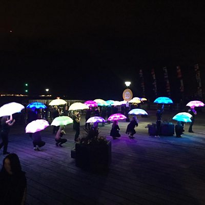 Gill Sennett at a unique performance that involved umbrellas!