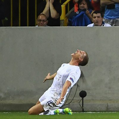 Marc Albrighton scores Leicester City's first goal in the Champions League. Photo: EMMANUEL DUNAND/AFP/Getty Images