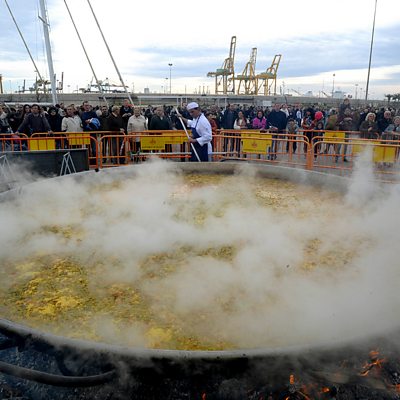 The British celebrity chef Jamie Oliver posted his own take on the Spanish paella dish to social media, claiming that "good Spanish food doesn't get much better than paella." However, his decision to include chorizo as an ingredient has caused an uproar online. Omar Allibhoy is a Spanish chef who runs the Tapas Revolution chain of restaurants in the UK. Dan Damon asked him: what makes a true Valencian paella? (Photo: A giant paella. Credit: Jose Jordan/Getty Images)