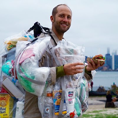 An American activist and adventurer is wearing all his rubbish... for a whole month! Rob Greenfield brings the 'waste-coat' to life, showing us just how much we throw away. He tells all to Malcolm Boyden.