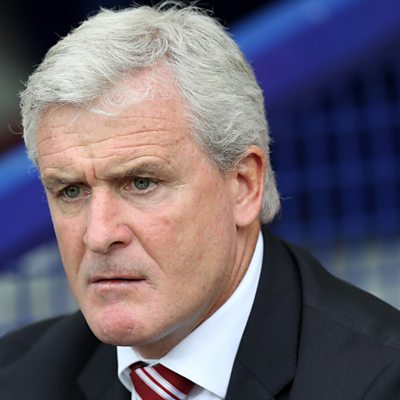 Stoke manager Mark Hughes speaks to Nigel Johnson following the 2-0 win over Sunderland.