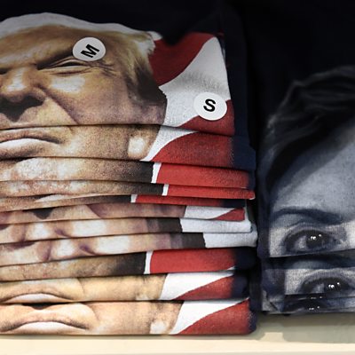 'We should not spend more time thinking about Donald Trump's policy ideas than he spent thinking them up': Professor Austan Goolsbee, economic adviser to Hillary Clinton talks tax with Diana Furchtgott-Roth, economic adviser to Donald Trump. (Photo: T-shirts supporting the US election candidates in a gift shop at Philadelphia International Airport, Pennsylvania. Credit: Robyn Beck/AFP/Getty Images)