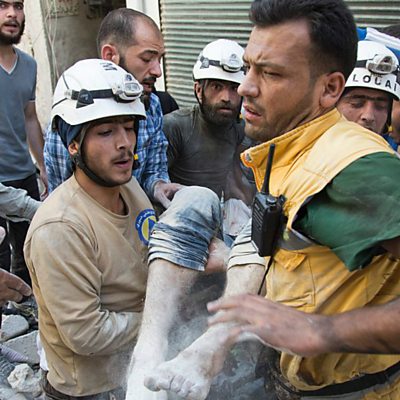 Ishmael al-Abdullah is haunted by scenes of human suffering he has witnessed in Aleppo in the last four years. He chose to stay when the fighting began and helped start the White Helmets rescue operation. (Photo: Syrian civil defence volunteers, known as the White Helmets, carry a body after digging it out from under the rubble of a building following a reported airstrike on the rebel-held district of al-Fardous in the northern city of Aleppo. Credit: Getty Images)