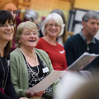 UWE ReVoice, a choir for people with aphasia, sing live. Sean Rafferty meets one of their members, David Worrall, who can't talk easily but can sing - beautifully! The photograph shows David on the right with his wife Irene sitting next to him. Photo credit: University of the West of England First broadcast: In Tune, Radio 3, 3 June 2016.