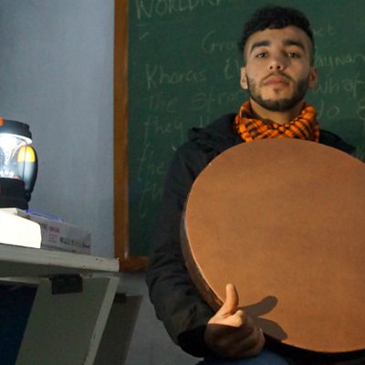 Refugee Rekan Ibrahimi recorded for the Calais Sessions with cellist Vanessa Lucas-Smith.