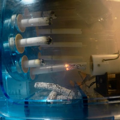 Professor Donald Ingber discusses how microchips lined by living human cells and a robotic smoker are revolutionising research into lung disease (Photo caption: The cigarettes are lit and burned in the rotating unit of the smoking machine in intervals that mimic the breathing patterns and smoking of real smokers © Wyss Institute at Harvard University)