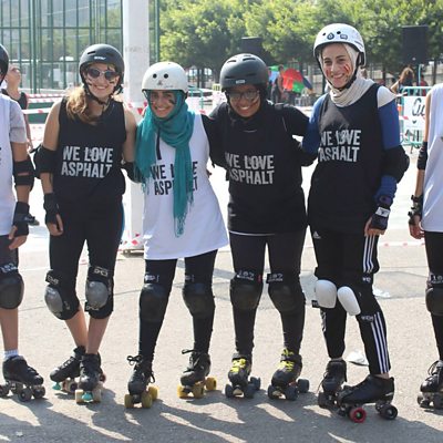 Hadeel Al-Hubaishi is a member of Lebanon's first all-female roller derby team and competes at Roller Derby Beirut. Rebecca Collard has been to see the team in action. Photo: Hadeel Al-Hubaishi (wearing the green scarf) with her Roller Derby team in Beirut, Lebanon. Credit: GAME NGO1