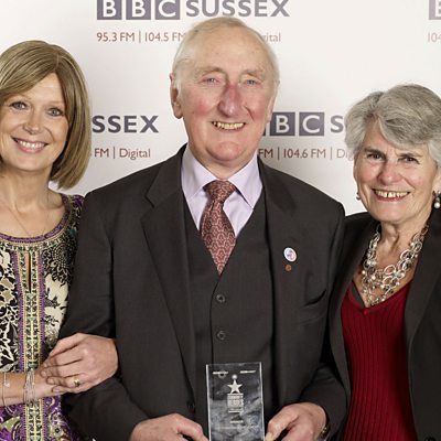 Amanda Jones, a previous recipient, presents Nigel Lewis-Baker with an Outstanding Achievement Award for his tremendous contribution to raising awareness of prostate cancer.